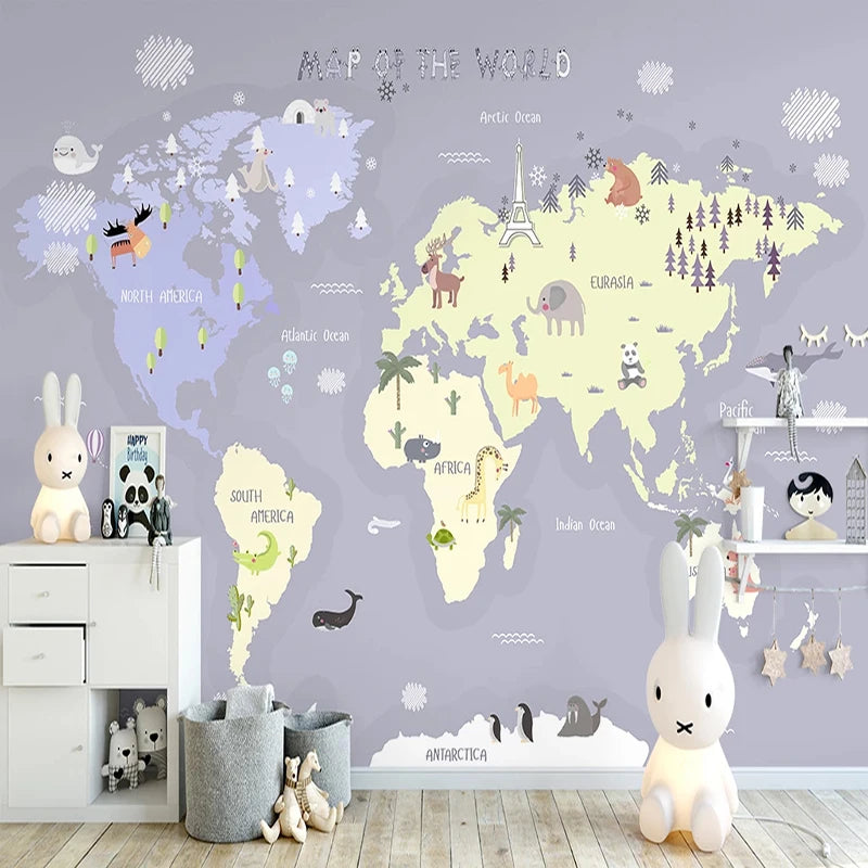 Illustrated Continents With Animals Nursery Wall Mural Wallpaper