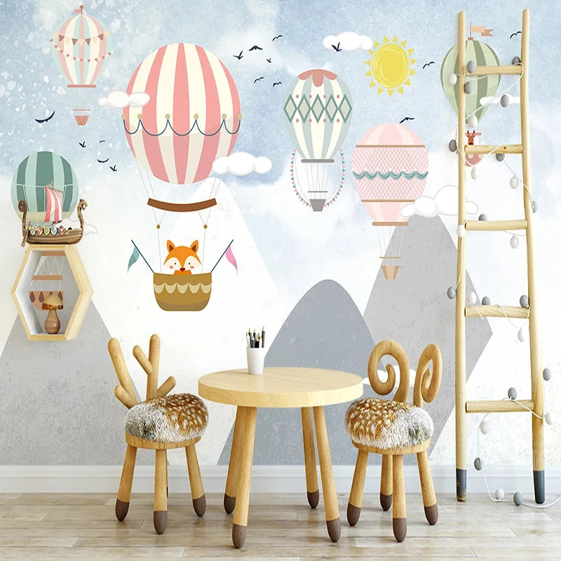 Striped Hot Air Balloons Over Mountain Peaks with Fox Pilot Wall Mural Wallpaper