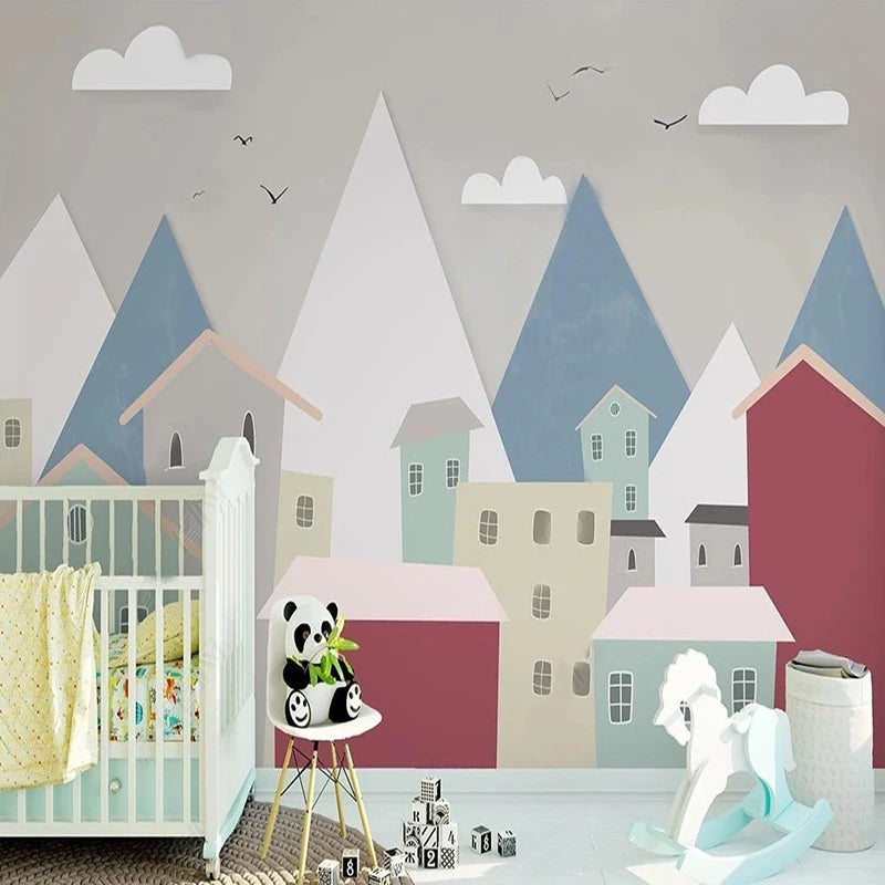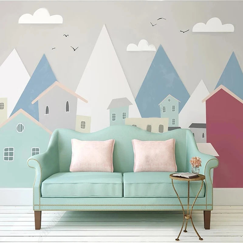 Geometric Mountainscape with Pastel Townhouses Wall Mural Wallpaper