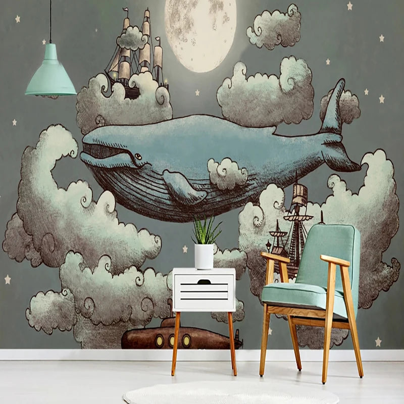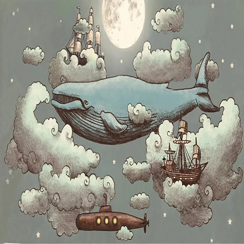 Celestial Whale and Sailing Ships Among Cloud Formations Wall Mural Wallpaper