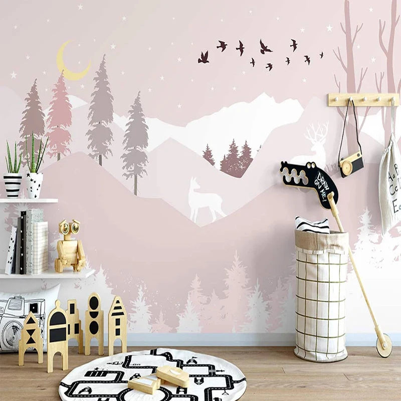 Pastel Color Woodland Scene Pink Wall Mural Wallpaper
