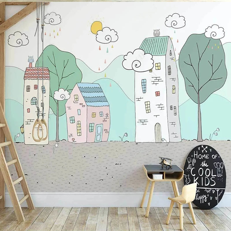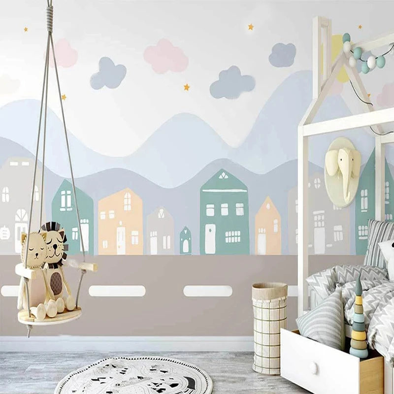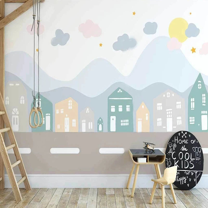 Cartoon Mountain Town Road Playroom Wall Mural Wallpaper