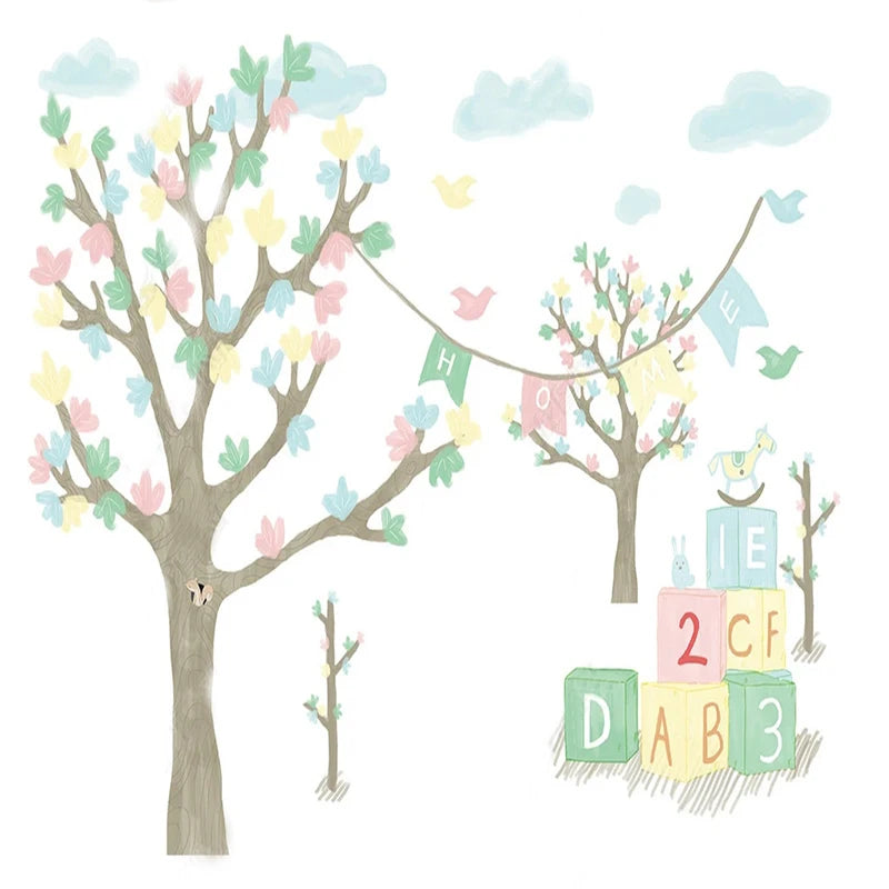 Flowering Trees with Home Banner Wall Mural Wallpaper