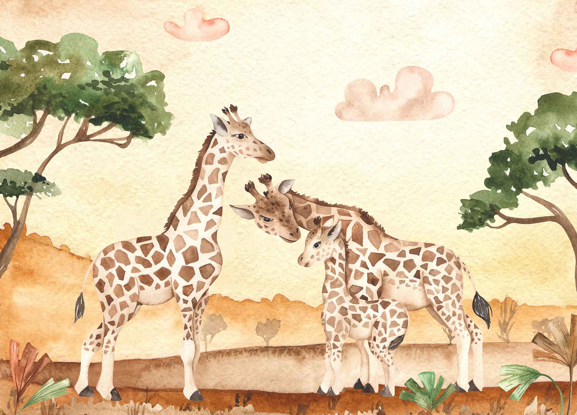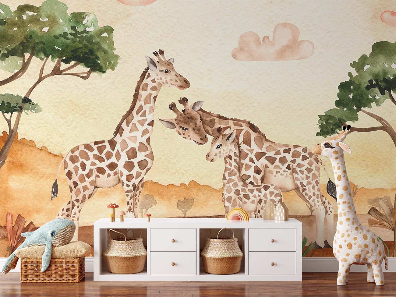 Giraffe and Zebras Watercolor Wallpaper Mural