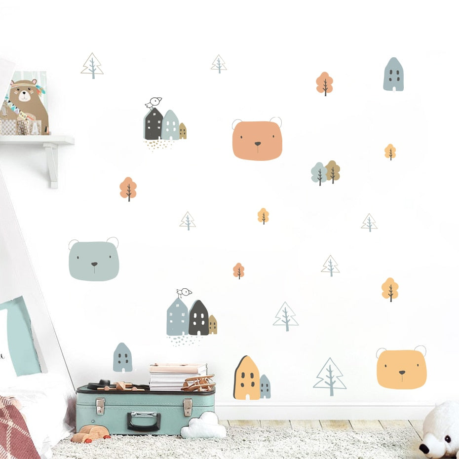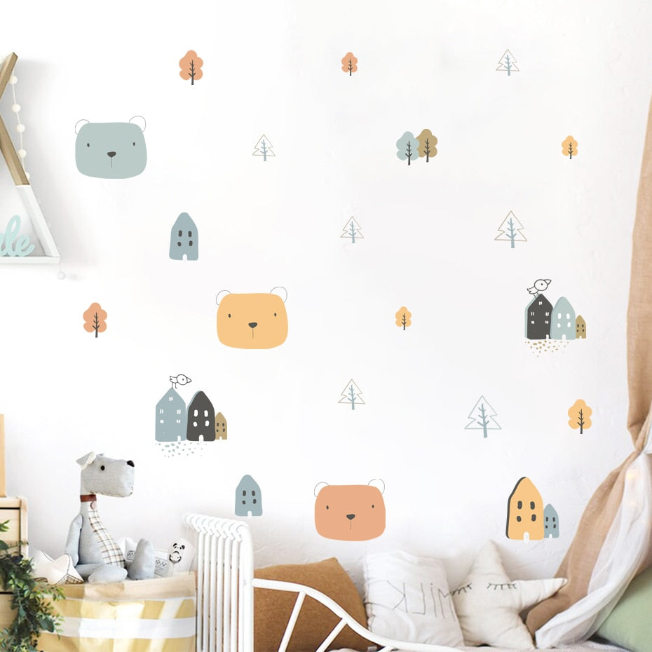 Cartoon Wall Decals House Trees Cute Bears